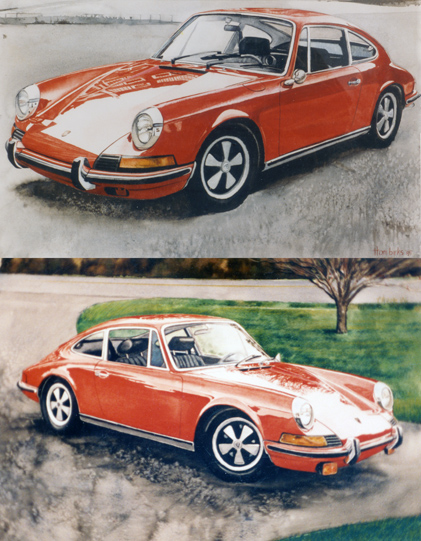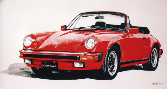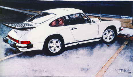 this is how i made a couple bucks after school… i would find people with Porsche automobiles and offer them a watercolor portrait of their prized autobahn runner. framed and matted they fetched a mere $500. sometimes, i got to drive the subject. the last one was a bright yellow 930 Turbo and the last time i ever wanted to drive fast. 120mph down cannonsburg rd. to parsons in short order. at the time, i had a ’73 914 and to drive that piece of VW/Porsche bastardization home was a complete let down. even with the $500 in pocket and the rush of driving a truly fast automobile.