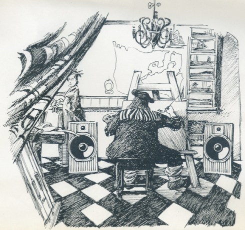 pen&ink drawing for a local company specializing in high-end audio equipment.(AudioAdvisors) mid 80s…when CDs were starting to take over analog. hope Vermeer likes the rendition