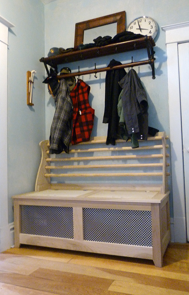 like it so, i decided to design and build a bench. mostly, made of poplar with some pine and birch. the horizontal pine dowels are set in loose to have some give on the person seated and are an accent that is pulled from the coat racks platform… and, will be stained in the same dark brown color as the rack.
