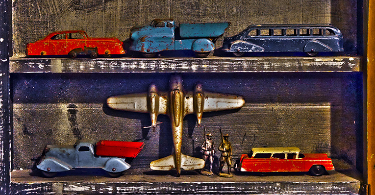 the little cast iron car in the upper left (in front of the red sedan) is from an old Monopoly game… the lead WWl soldiers are from the early 1920s. the other cars/buses/trucks/twin prop are all stamped between the mid 40s-50s