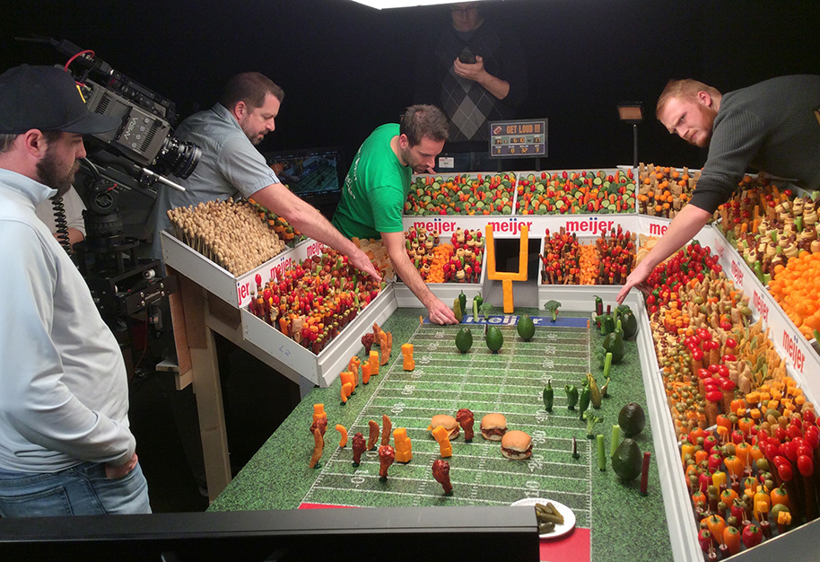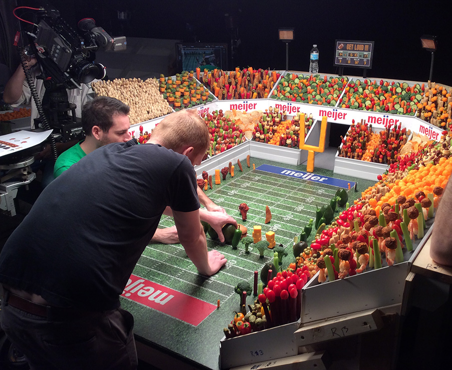 some production stills from Gorilla, GFS and Meijer. Meijer stadium set was designed and built by Dean Horn’s team and delivered to the Meijer media site for stop-motion production. DP, J.Jordan. The GFS piece was also filmed time-lapse on a motion controlled rig with Nikon glass. DP, M.Kausch