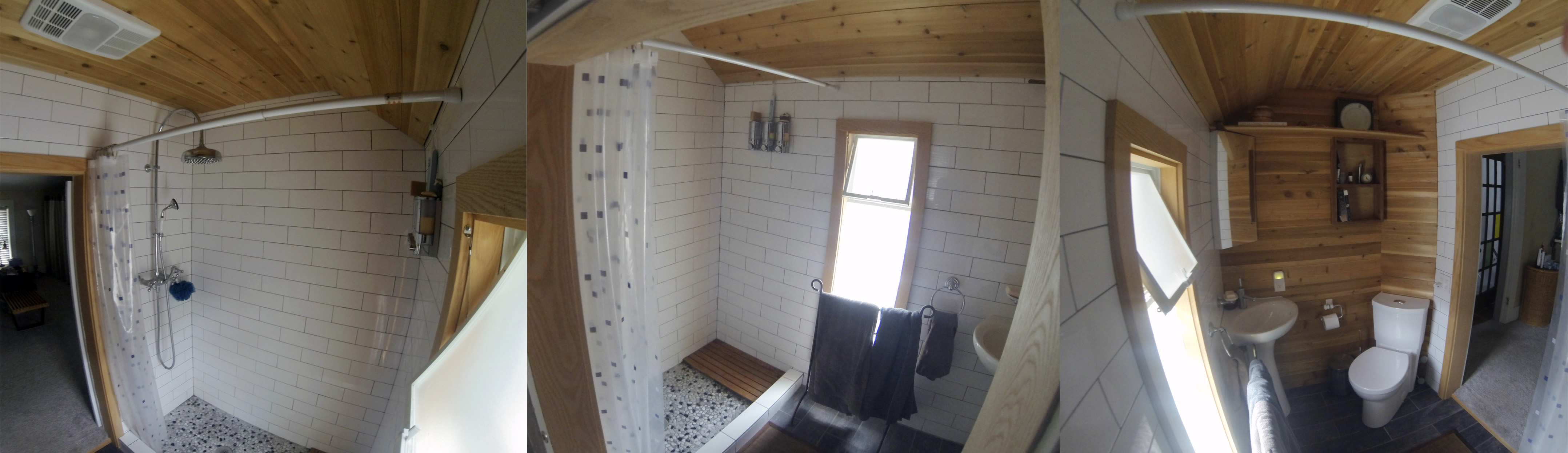 Wood style ceramic tile on floor and subway tiles with accents on shower walls with cedar on the ceiling and small interior wall and oak trim.